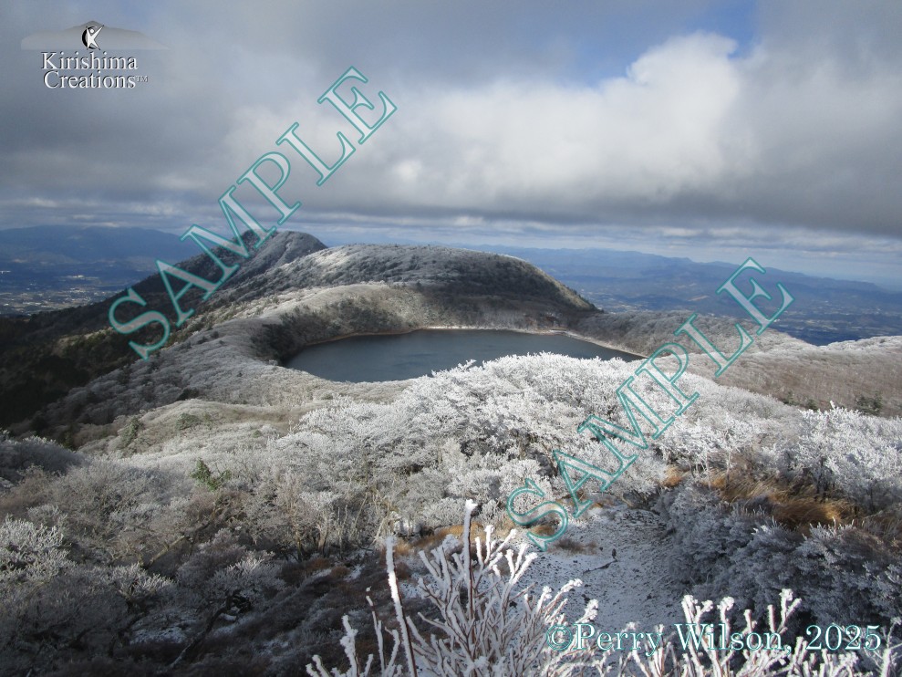 9- Mt. Takachiho-no-mine, Mt. Nakadake, Mt. Shinmoe, and Ohata Lake from Mt. Maruoka. 丸岡山からの高千穂峰、中岳、新燃岳、大幡湖