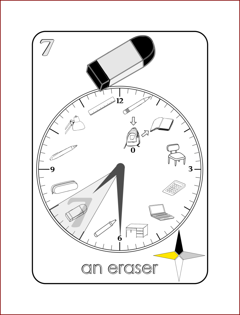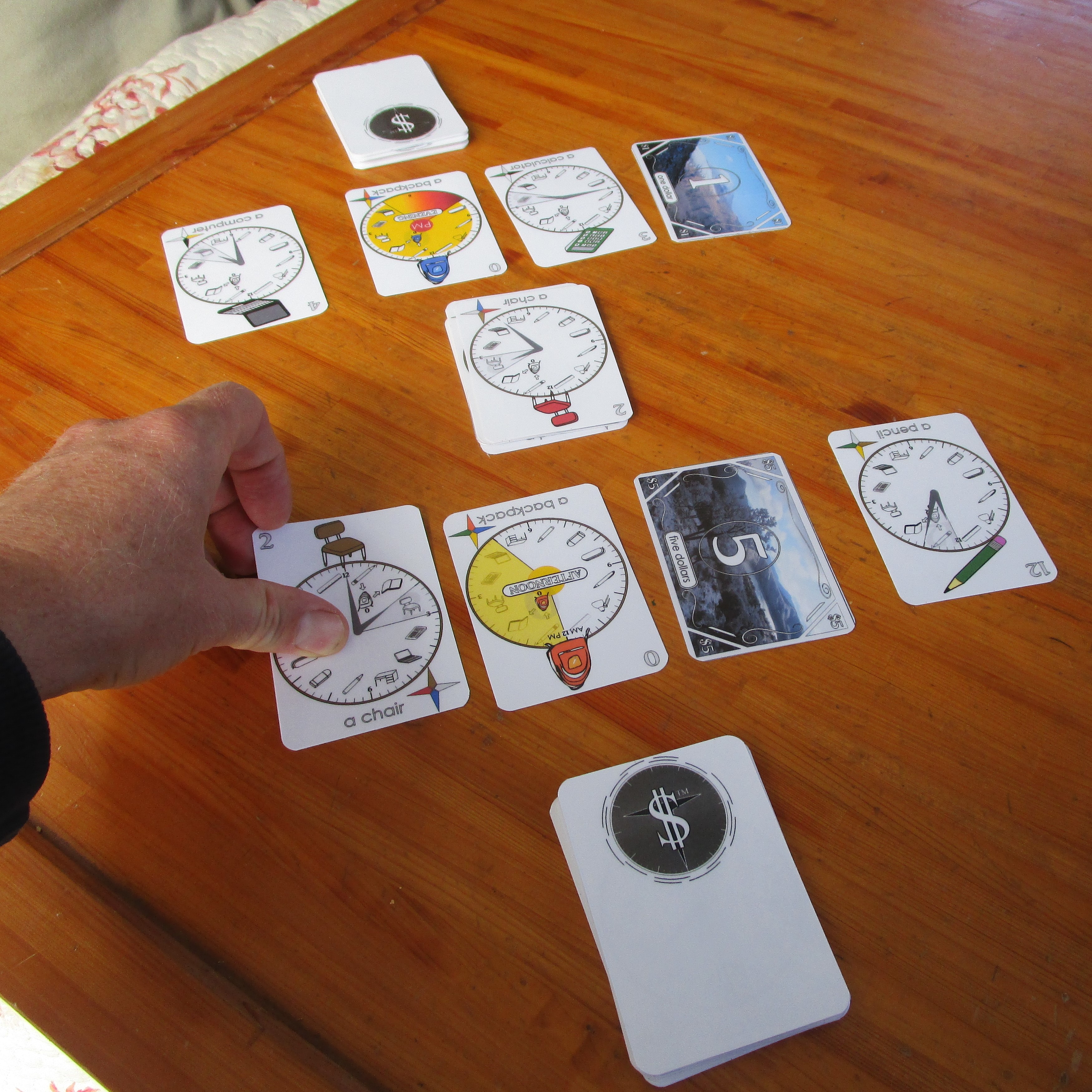 Study Time is the flagship game of this versatile deck- one develops multiple skills in this family-friendly game: colors, singular/plural nouns (study tools), time-telling, and money skills (including the art of negotiation)