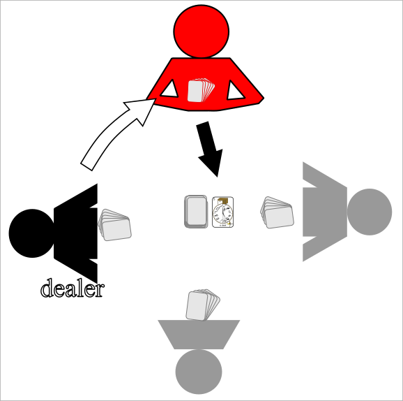 3. Player 1 (to the left of the dealer) may play one card on the central card if a match exists.